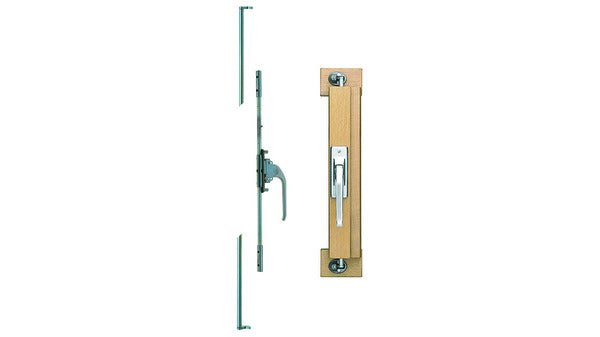 verdeckt liegender, einseitig bedienbarer Verschluss für 2-flüglige Fenster und Türen, verwendbar für alle Verglasungsarten Garnitur (ohne Stange) bestehend aus: 1 Mittelstück (Getriebe) Stahl verzinkt, Länge 400 mm, mit Hülsen zur Aufnahme der Stangen 1 Griff mit Deckplatte Druckguss verchromt matt 1 Satz Zubehörteile verzinkt, inkl. Befestigungsschrauben