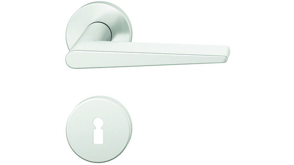 Design Johannes Potente mit Hochhaltefeder Garnitur bestehend aus: 1 Drückerpaar, Verbindungsstift, Drücker- und Schlüsselrosetten ø 55/7 mm, mit Befestigungsschrauben
