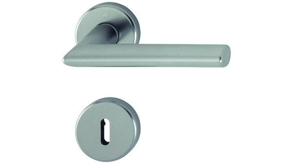 Garnitur bestehend aus: 1 Drückerpaar, Schnellstift-Verbindung, Drücker- und Schlüsselrosetten 53/9 mm, mit Befestigungsschrauben