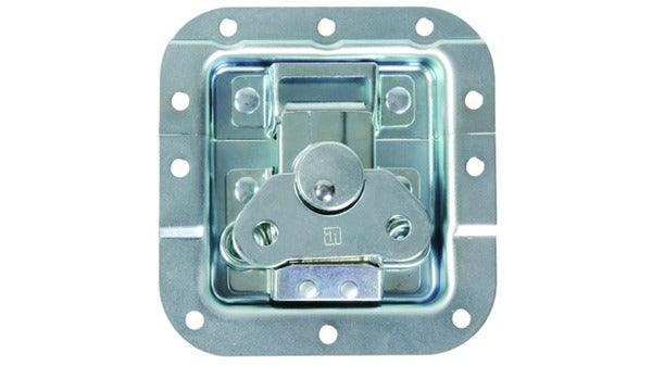 beidseitig gekröpfte Einbauschale, geeignet um den Höhenunterschied des Schiessprofils (87.300.01-02) auszugleichen mit Eindrückfeder Die Funktion der Feder drückt nach Öffnung des Deckels den Mechanismus zurück in die Schale. Beim Aufdrehen des Flügels hebt eine Rampe in der Schale den Haken aus der Schliesse. Befestigungslöcher ø 5,1 mm benötigte Blindnieten: 4 Stück 4,8 x 7,5 mm und 6 Stück 4,8 x 14,7 mm